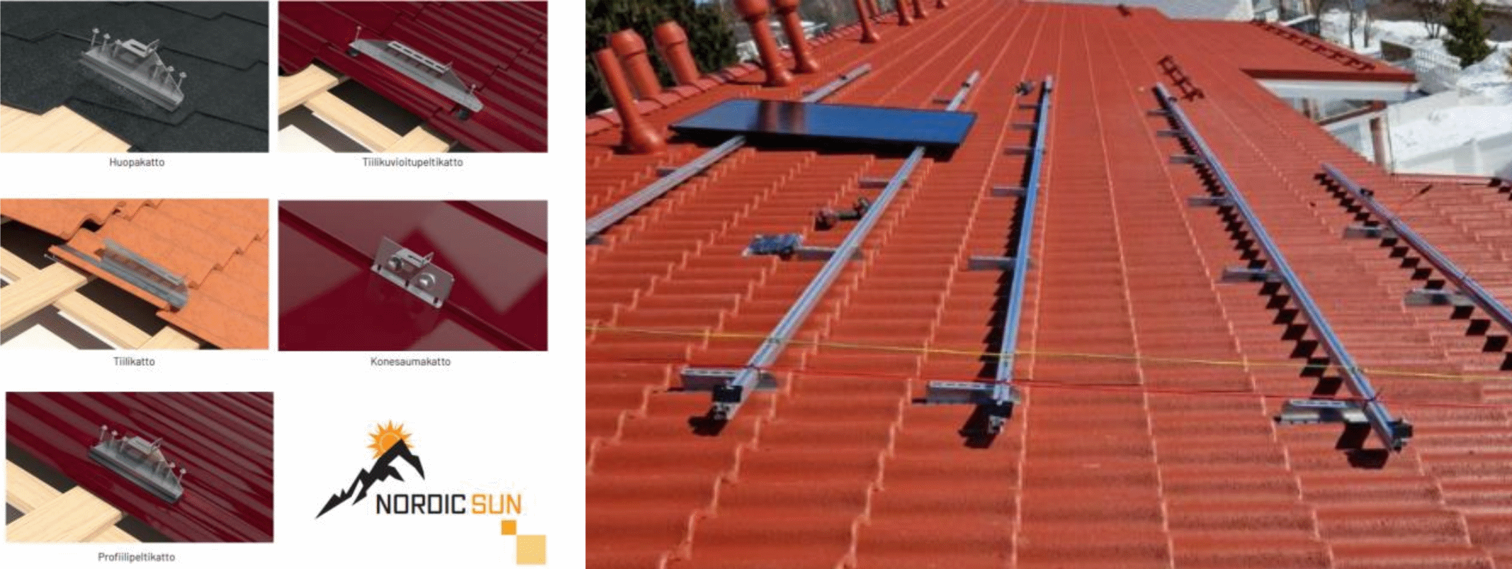 Järjestelmä sisältää erilaisia kattokohtaisia kiinnikkeitä, joiden avulla paneelit voidaan asentaa turvallisesti ja siististi katon rakenteita vahingoittamatta.